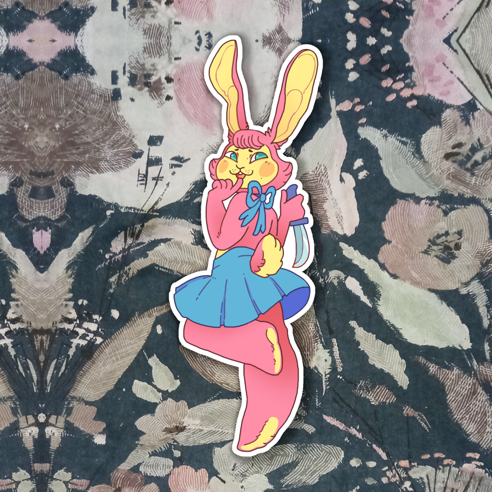 A collaborative matte vinyl sticker by Muura and Sulo! This playful bunnyrabbit was inspired by vintage rubber face plushies like Rushton. Suitable for indoor and outdoor use with up to 4 years of outdoor durability.