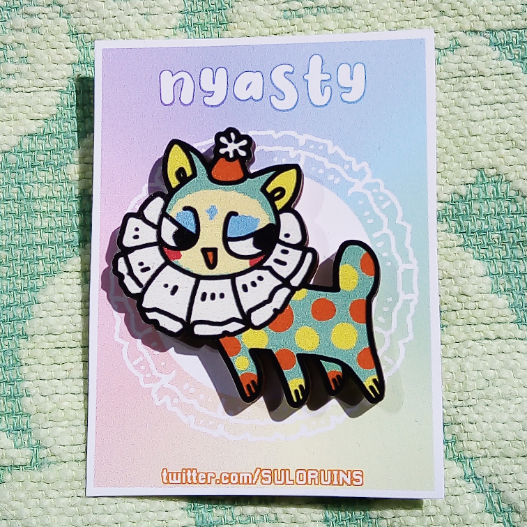 A wooden pin by Sulo! Printed on 3mm thick plywood. Has two silver pins with butterfly clutches.